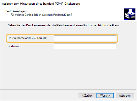 Geben Sie [Druckername oder IP-Adresse] ein, und klicken Sie auf [Weiter].