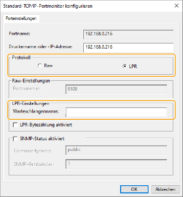 Wählen Sie unter [Protokoll] die Option [LPR], und geben Sie [Warteschlangenname] unter [LPR-Einstellungen] ein.