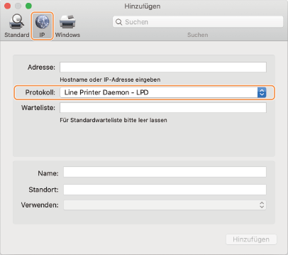 Klicken Sie auf [IP] in der Symbolleiste, und wählen Sie [Line Printer Daemon – LPD] unter [Protokoll].