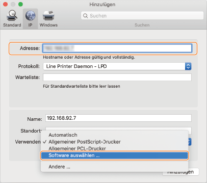 Geben Sie die IP-Adresse dieses Geräts unter [Adresse] ein, und wählen Sie [Software auswählen] unter [Verwenden].