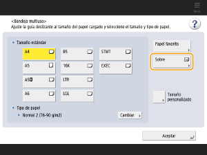 Al cargar sobres en la bandeja multiuso, aparece la pantalla para configurar el tamaño del papel. Establezca el tamaño del papel de la manera siguiente.