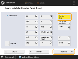 En función del modelo, puede ser que no pueda seleccionarse la opción <Tamaño libre>. En ese caso, seleccione uno de los tamaños de papel existentes, como <A4> o <LTR>.