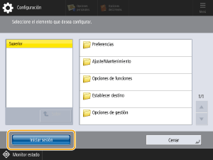 <Opciones personales> o <Opciones de dispositivo> solo aparecen en la pantalla Configuración cuando ha iniciado sesión un administrador. Cuando haya seleccionado alguno de los dos, ya no aparecerán más mientras esté con la sesión iniciada. Si sale de la sesión y vuelve a iniciarla después, volverá a aparecer la pantalla para seleccionar <Opciones personales> o <Opciones de dispositivo>.