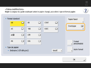 Lorsque vous avez chargé les enveloppes dans le plateau multifonctions, l’écran de réglage de format papier apparaît. Réglez le format papier comme suit.