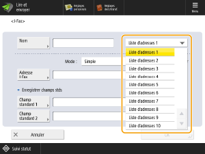 <Liste d'adresses 1> à <Liste d'adresses 10> peut être relié à 10 carnets d’adresses. L’enregistrement de destinataires sur des listes d’adresses pour chaque service ou partenaire commercial facilite la recherche de destinataires lorsque vous les spécifiez. Cela facilite aussi la gestion des listes d’adresses en renommant simplement un service ou un partenaire commercial.
