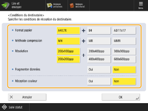 Confirmez les spécifications de l'appareil destinataire avant de configurer ces réglages. Si vous réglez des conditions non prises en charge par l’appareil destinataire, cela pourrait causer une erreur.