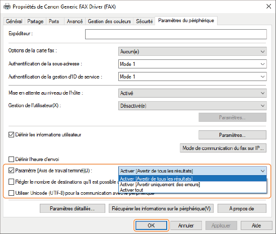 Sur l'onglet [Paramètres du périphérique], sélectionnez [Paramètre [Avis de travail terminé]] et cliquez sur [OK].