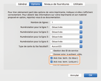 Sur l'onglet [Options], sélectionnez le réglage [Avis de travail terminé] et cliquez sur [OK].