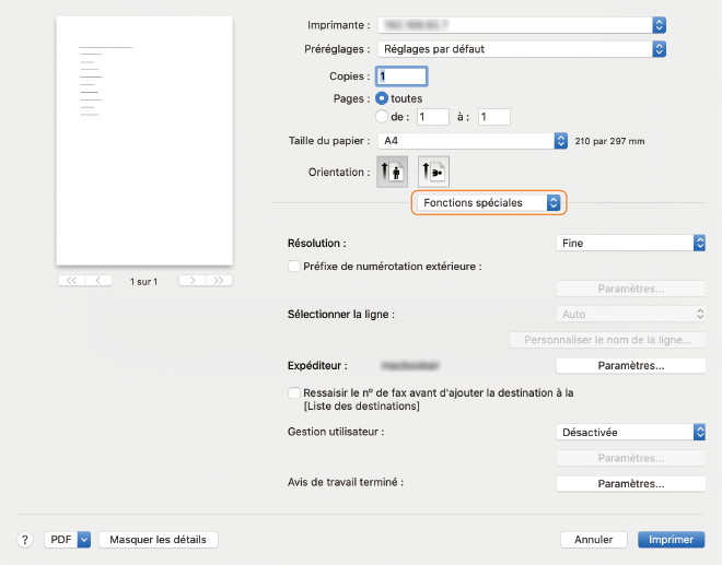 Sélectionnez [Fonctions spéciales] dans le menu contextuel de la boîte de dialogue d'impression.