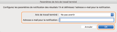 Sélectionnez [Avis de travail terminé], saisissez une adresse e-mail dans [Adresse e-mail pour la notification] et cliquez sur [OK].