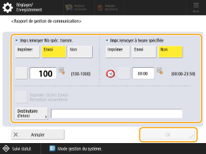 Si <Afficher le journal des tâches> dans <Réglages de gestion> est réglé sur <Non>, vous ne pouvez pas configurer les réglages de rapport de gestion des communications. De plus, si pour <Afficher le journal des tâches> dans <Réglages de gestion>, vous remplacez <Non> par <Oui>, les options <Impr./envoyer Nb spéc. transm.> et <Impr./envoyer à heure spécifiée> pour les rapports de gestion des communications sont automatiquement réglées sur <Non>.
