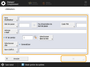 Enregistrez les informations d’utilisateur soit depuis l’interface utilisateur distante, soit depuis le panneau de commande de cet appareil. Vous pouvez utiliser le panneau de commande cet appareil pour enregistrer les informations d’utilisateur, mais vous ne pouvez pas l’utiliser pour enregistrer chaque élément.