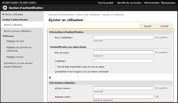 La gestion des utilisateurs sur cet appareil est principalement effectuée à l’aide de l'application d’authentification appelée authentification de l’utilisateur (service de connexion).