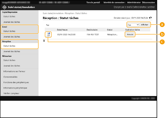 Vous pouvez vérifier le statut des documents en attente d'être faxés ou envoyés par e-mail, des documents faxés reçus et des documents faxés en attente d'être transférés. Vous pouvez aussi annuler l'envoi ou la réception de documents.