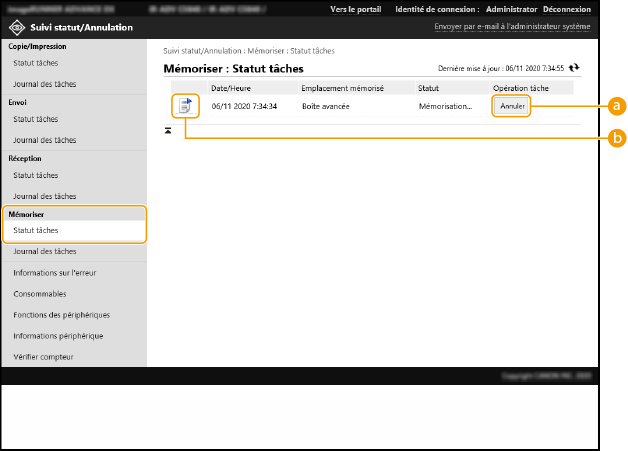 Cette section explique comment utiliser l'interface utilisateur distante pour vérifier le statut des tâches sur cet appareil et annuler ou reprendre des tâches.