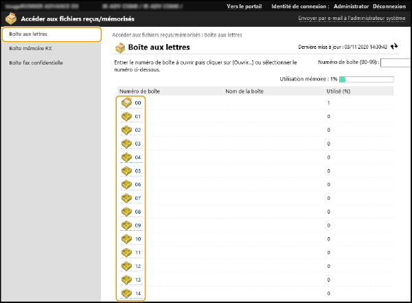 Sur la page [Boîte aux lettres], cliquez sur le numéro de la boîte aux lettres.