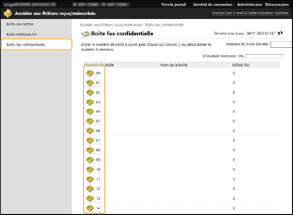 Sélectionnez la page [Boîte fax confidentielle] puis cliquez sur le numéro de la boîte de réception des fax.