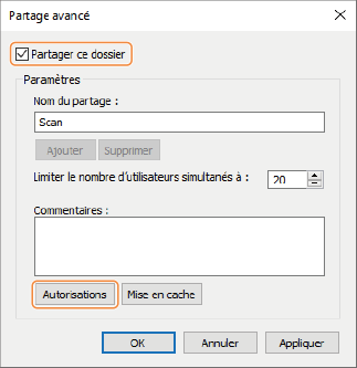 Cochez la case pour [Partager ce dossier] et cliquez sur [Autorisations].