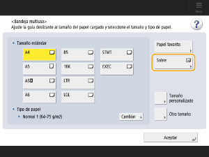 Al cargar sobres en la bandeja multiuso, aparece la pantalla para configurar el tamaño del papel. Establezca el tamaño del papel de la manera siguiente.