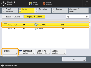 Seleccione el trabajo de fax cuyos detalles quiere comprobar y pulse <Detalles>.