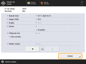 Si los documentos se han enviado o recibido sin problemas, aparece <Aceptar> en el campo <Resultado>. <Incorr.> indica que se ha cancelado el envío o la recepción o que ha ocurrido un error.