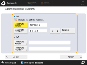 Si hubiera un servidor DNS secundario, pulse <Servidor DNS secundario> e introduzca la dirección IP. Para seguir sin especificar ningún servidor DNS secundario, introduzca "0.0.0.0".