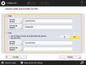 Si el nombre de host y el nombre de dominio son los mismos que los establecidos para IPv4, pulse <Sí> en <Usar el mismo nombre de host/nombre de dominio que para IPv4>. Para configurar otras opciones distintas, pulse <No>.
