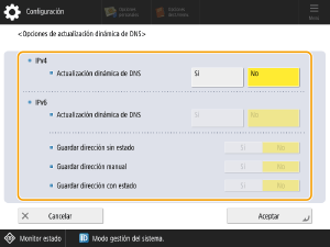 En <Guardar dirección sin estado>/<Guardar dirección manual>/<Guardar dirección con estado>, establezca la dirección para guardar en el servidor DNS en <Sí>. Tenga en cuenta que las opciones no se actualizarán automáticamente si todo esto está establecido en <No>.