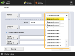 <Lista de direcciones 1> a <Lista de direcciones 10> pueden vincularse a 10 libretas de direcciones. Guardar destinos en listas de direcciones para cada departamento o socio de negocios facilita encontrar destinos cuando se especifican. También facilita gestionar listas de direcciones simplemente cambiando el nombre de un departamento o socio de negocio.