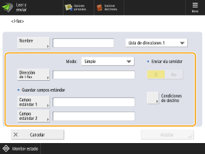 Seleccione <Lleno> si desea comprobar si se ha entregado un I-fax al equipo del destinatario o seleccione <Simple> si desea comprobar si se ha entregado un I-fax a un servidor de correo. Tenga en cuenta que no puede confirmar los resultados de envío si el equipo del destinatario no admite la función <Modo:>.