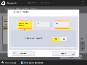 Si se produce un error de envío de fax o se cancela una transmisión, se imprime un informe de TX de fax. Si se ha seleccionado <Sólo en caso de error> en esta opción, siga el procedimiento que se indica a continuación para que no se imprima un informe de TX.