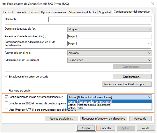 En la pestaña [Configuraciones del dispositivo], seleccione [Configuración de [Aviso de tarea terminada]] y haga clic en [Aceptar].