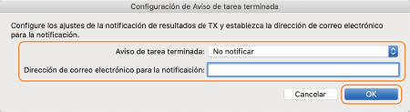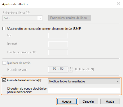 Seleccione [Aviso de tarea terminada], introduzca una dirección de correo electrónico en [Dirección de correo electrónico para la notificación] y haga clic en [Aceptar].