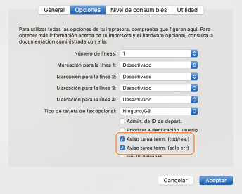 En la pestaña [Opciones], seleccione la opción [Aviso de tarea terminada] y haga clic en [Aceptar].
