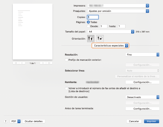 Seleccione [Características especiales] en el menú emergente del cuadro de diálogo de impresión.