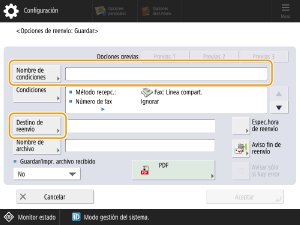 Introduzca <Nombre de condiciones> y pulse <Reenviado a>.