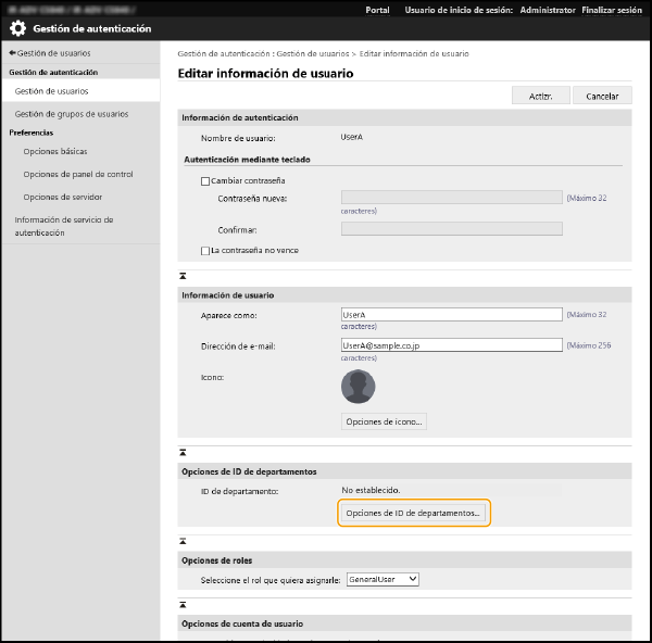 La información de usuario y las contraseñas que se usan para gestionar los ID de departamento deben coincidir con la información registrada para la autenticación local del dispositivo en Autenticación de usuario. Si un ID de departamento o PIN registrado ha cambiado, por ejemplo, debido a la distribución de información del equipo, también debería cambiar la información de usuario que se utiliza para la autenticación local del dispositivo.