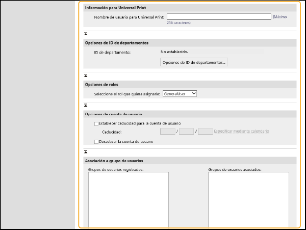 Cuando la información de usuario también se utiliza para la gestión de ID de departamento, debe hacer clic en [Opciones de ID de departamentos] y seleccionar en la lista el ID del departamento del usuario. Primero guarde el ID de departamento necesario usando [Guardar nuevo departamento] en la pantalla de la lista. Si el ID de departamento seleccionado aquí se elimina, no se olvide de cambiar esta opción.