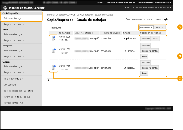 En esta sección se describe cómo utilizar la IU remota para consultar el estado de los trabajos en este equipo y para cancelar o reanudar trabajos.
