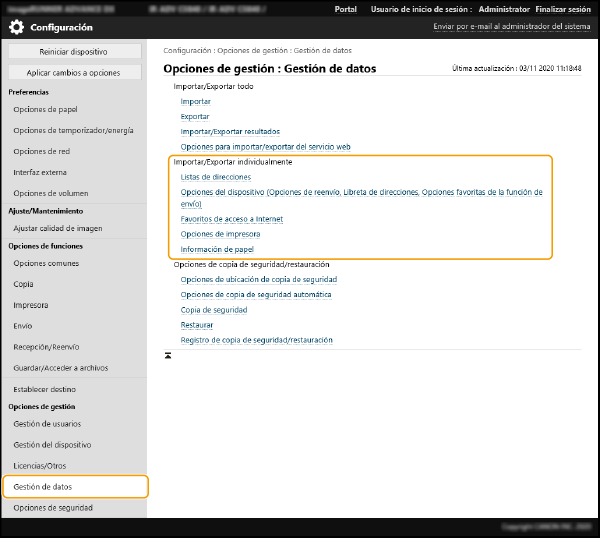 También puede seleccionar opciones concretas para importar o exportar, como listas de direcciones de la Libreta de direcciones u opciones de la impresora. Para realizar esta tarea, inicie sesión con privilegios de Administrador en la IU remota.