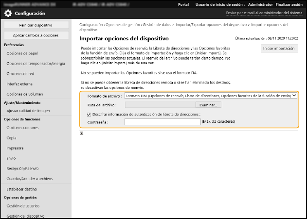 La importación y exportación de datos debe realizarla un administrador con privilegios de Administrador. Al importar datos se sobrescribe información como la libreta de direcciones, las opciones de usuario y las opciones de red. Según la función que se utilice, es posible que la importación no se realice correctamente y que provoque fallos operativos, de modo que debe realizarse con cuidado.