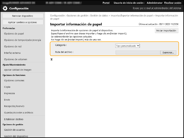 La importación por lotes de los datos de configuración en un ordenador permite, por ejemplo, importar las opciones de un equipo antiguo en un equipo recién instalado. Si utiliza varias impresoras multifunción Canon*, puede utilizar esta función para copiar las opciones de un equipo a otro rápidamente, ahorrándose la molestia de tener que configurar las mismas opciones para veces. Para realizar esta tarea, debe iniciar sesión en la IU remota con privilegios de Administrador.