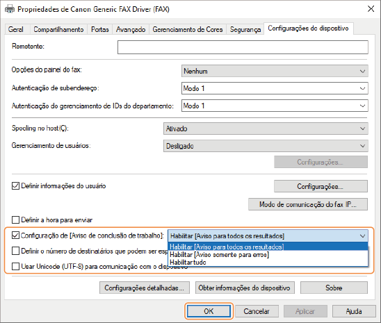 Na aba [Configurações do dispositivo], selecione [Configuração de [Aviso de conclusão de trabalho]] e clique em [OK].