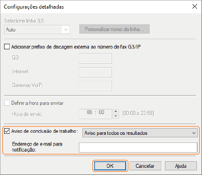 Selecione [Aviso de conclusão de trabalho], insira um endereço de e-mail em [Endereço de e-mail para notificação] e clique em [OK].
