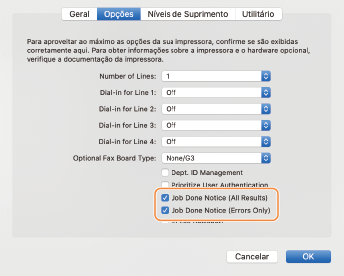 Na aba [Options], selecione a configuração [Job Done Notice] e clique em [OK].