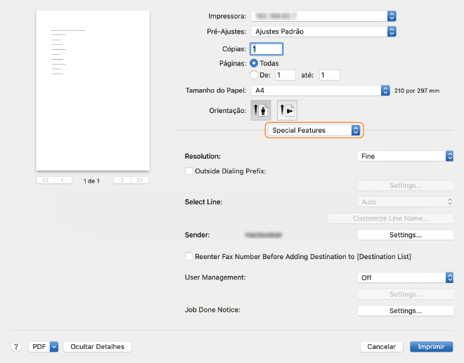 Selecione [Special Features] no menu pop-up da caixa de diálogo de impressão.