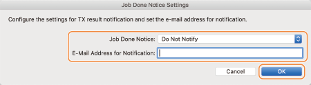 Na caixa de diálogo [Job Done Notice Settings], selecione [Job Done Notice] e digite um endereço de e-mail em [E-Mail Address for Notification]. Depois clique em [OK].