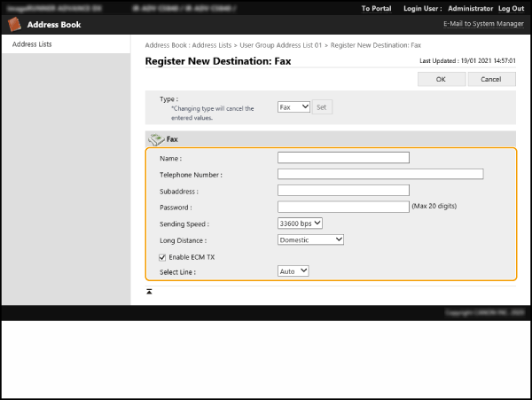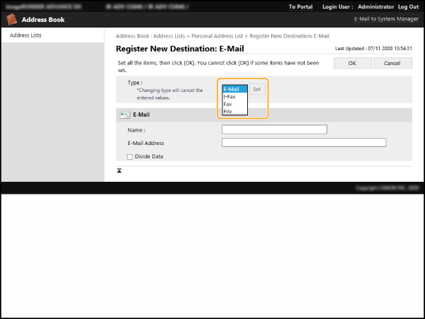 Selecione o tipo de destino em [Type] e clique em [Set].