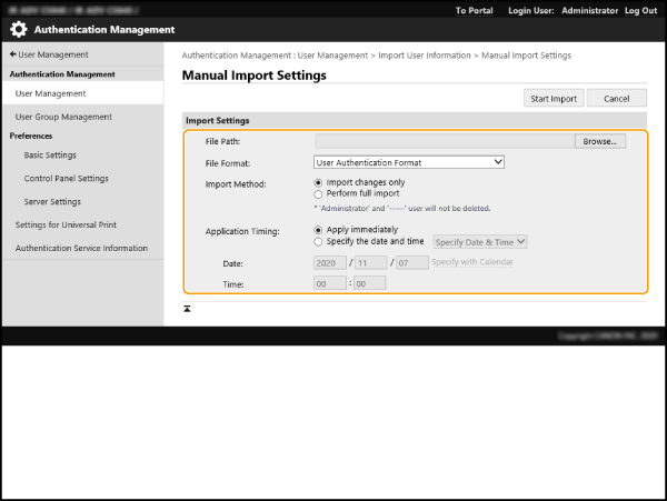 Quando você executa uma importação completa, os usuários não listados no arquivo de importação são excluídos desta máquina. No entanto, os usuários padrão "-----" e "Administrador" registrados no momento do envio são retidos, mesmo se omitidos do arquivo de importação.