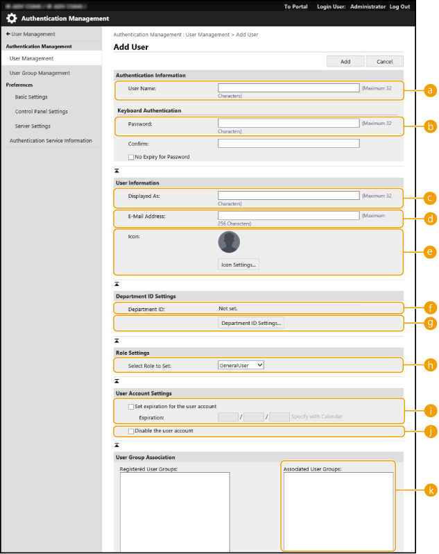 dc | Não | De 0 a 32 caracteres | Controle caracteres | - (N/D) | Não pode ser alterado. Será automaticamente atribuído aos próximos usuários. Usuários registrados após a autenticação do servidor Usuários registrados por <Register Automatically When Job Is Received> no Login de Foto